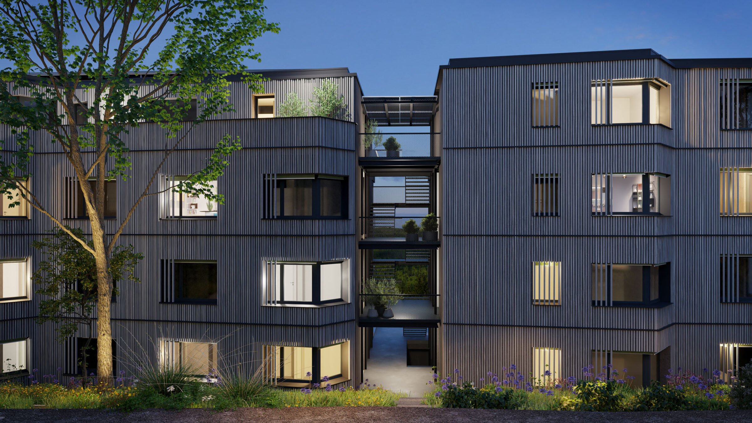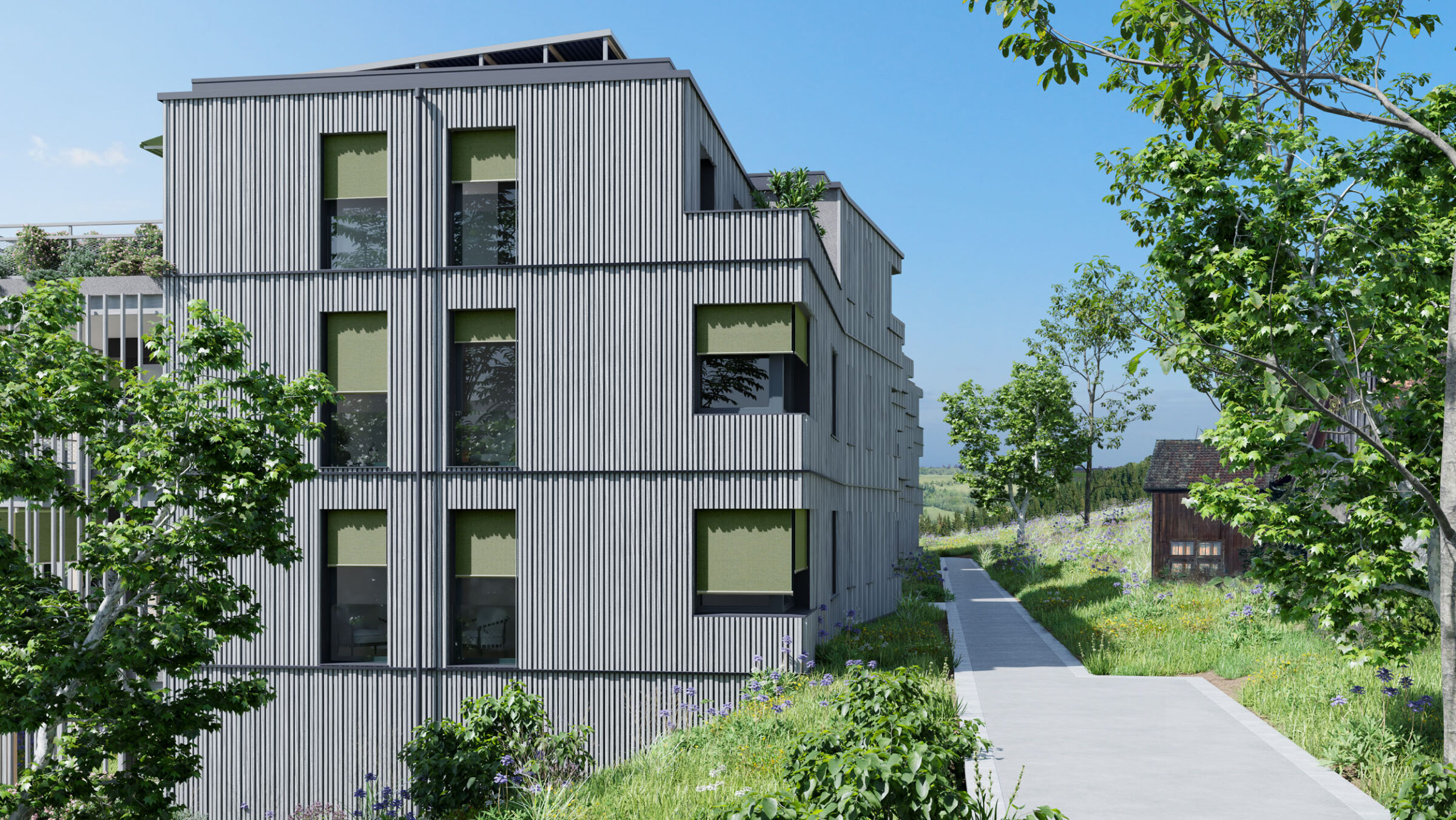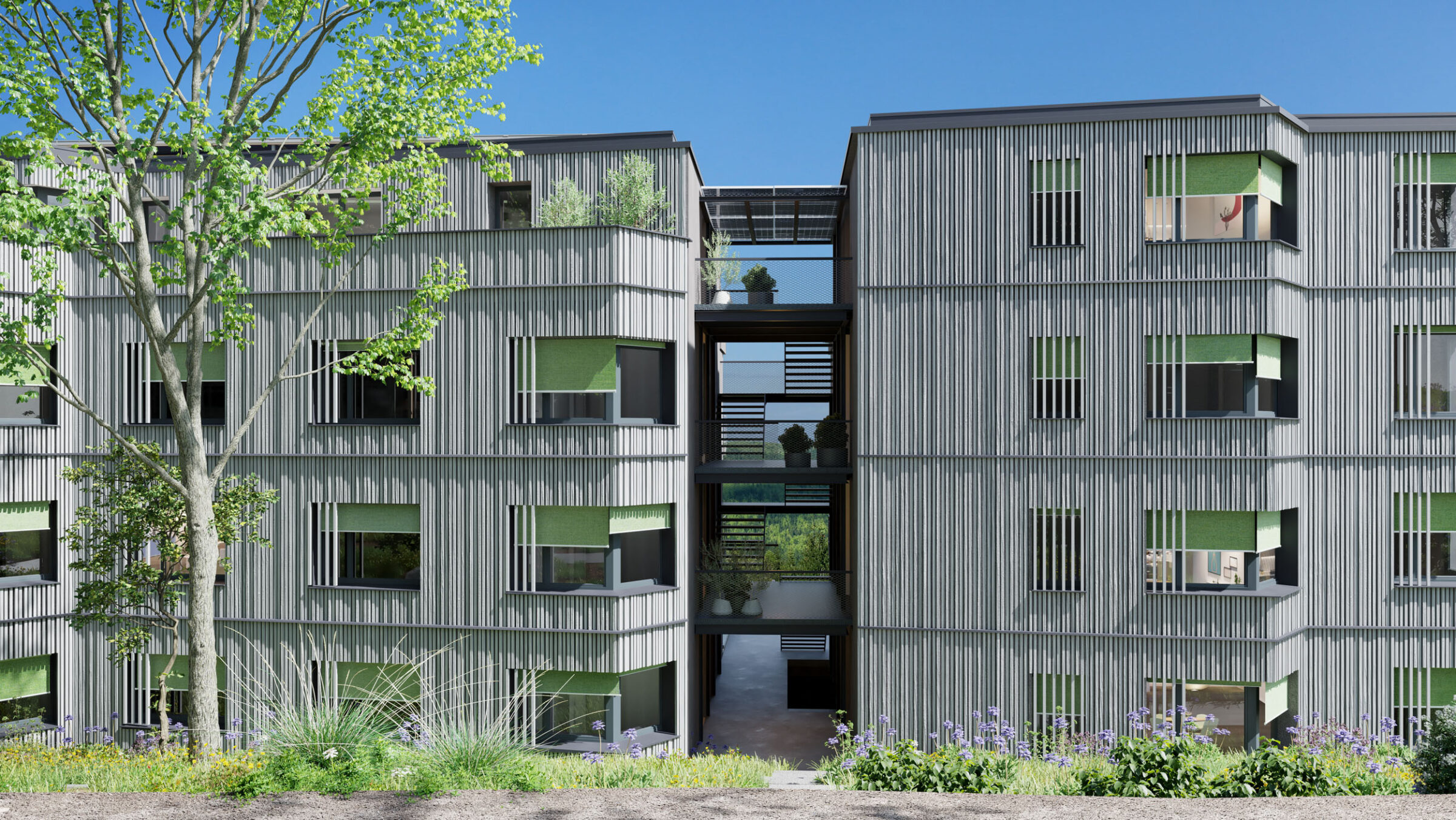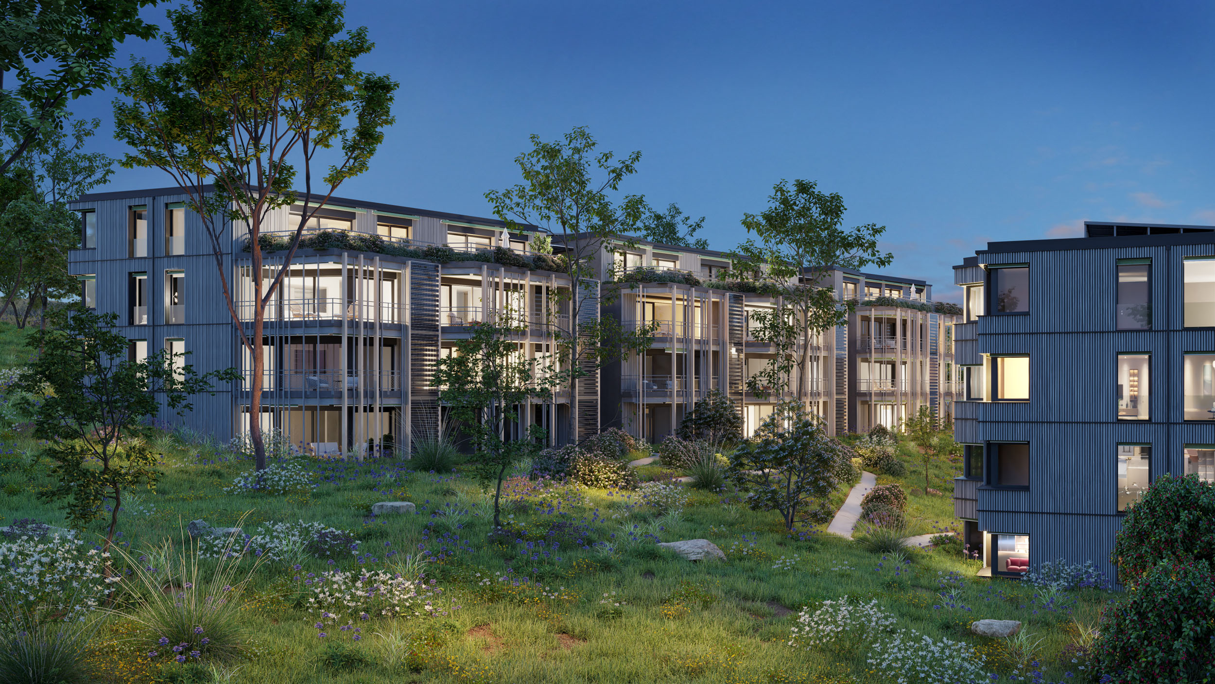Feucht- und Trockenbiotope, extensiv begrünte Dachterrassen sowie ein Spielplatz und Begegnungszonen komplementieren diese Wohlfühloase. Die Photovoltaikmodule auf dem Dach mit hausinterner, geplanter Speicheranlage versorgen die Bewohner und E-Ladestationen mit Strom. Über die Heizungsanlage (Erdsonden-Wärmepumpe) lassen sich die Gebäude im Sommer passiv kühlen für ein ganzjähriges Wohlfühlklima.