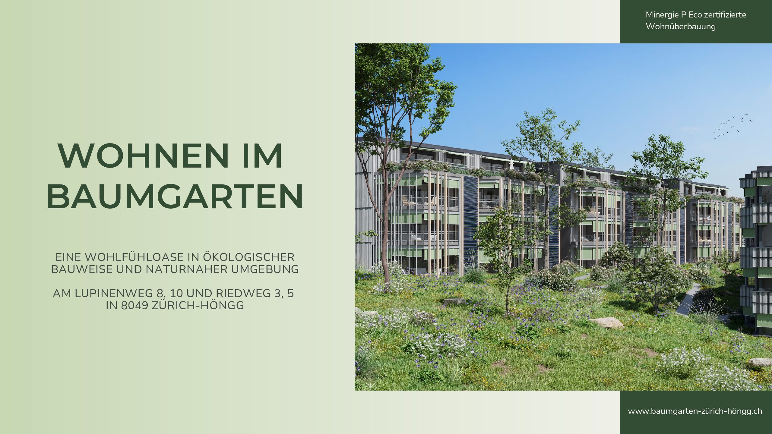 Eine Wohlfühloase in ökologischer Bauweise und naturnaher Umgebung am Lupinenweg 8, 10 und Riedweg 3, 5 in 8049 Zürich-Höngg.
