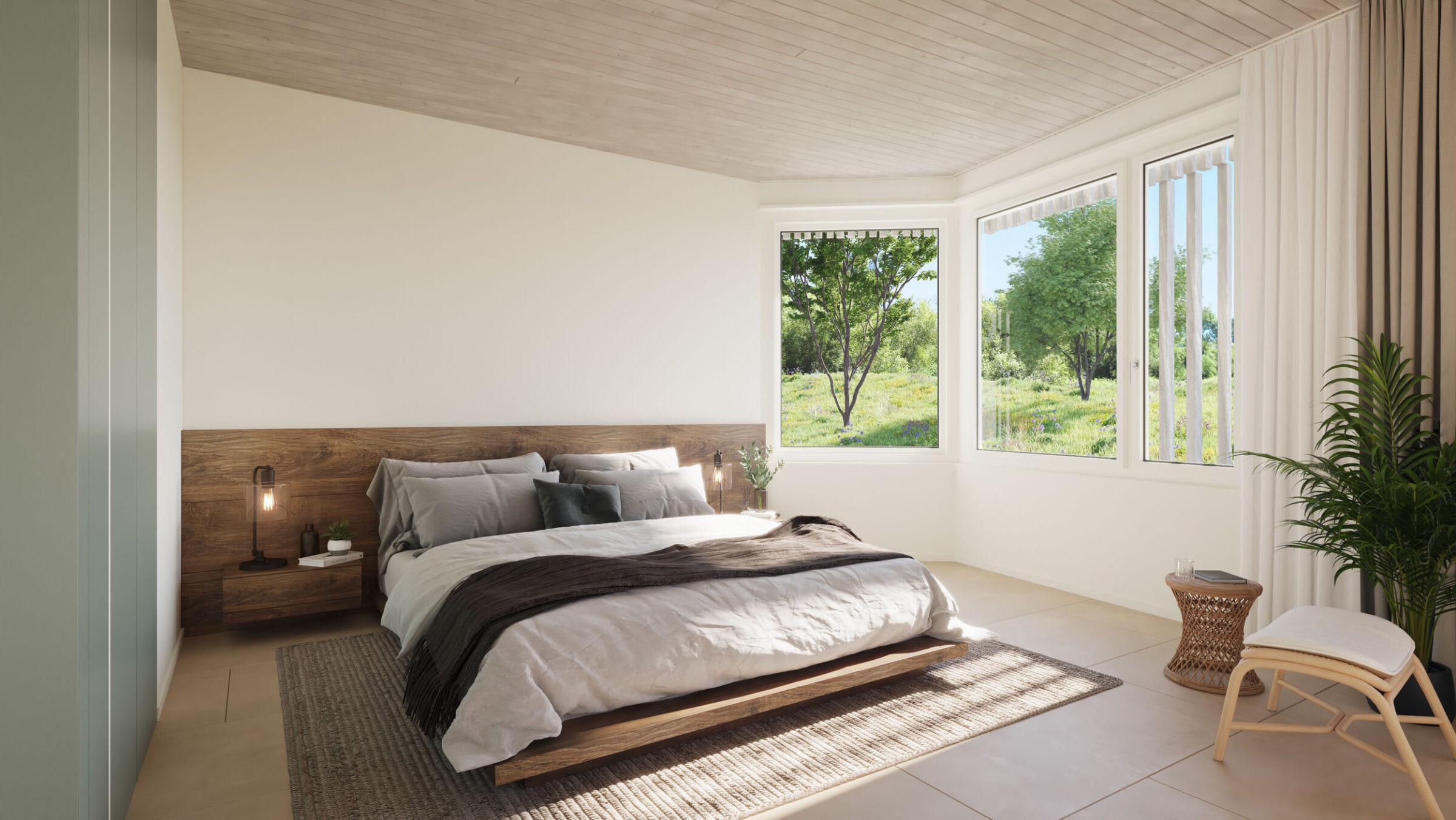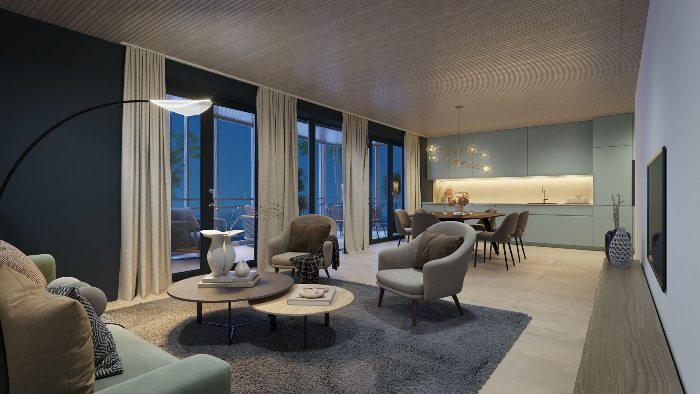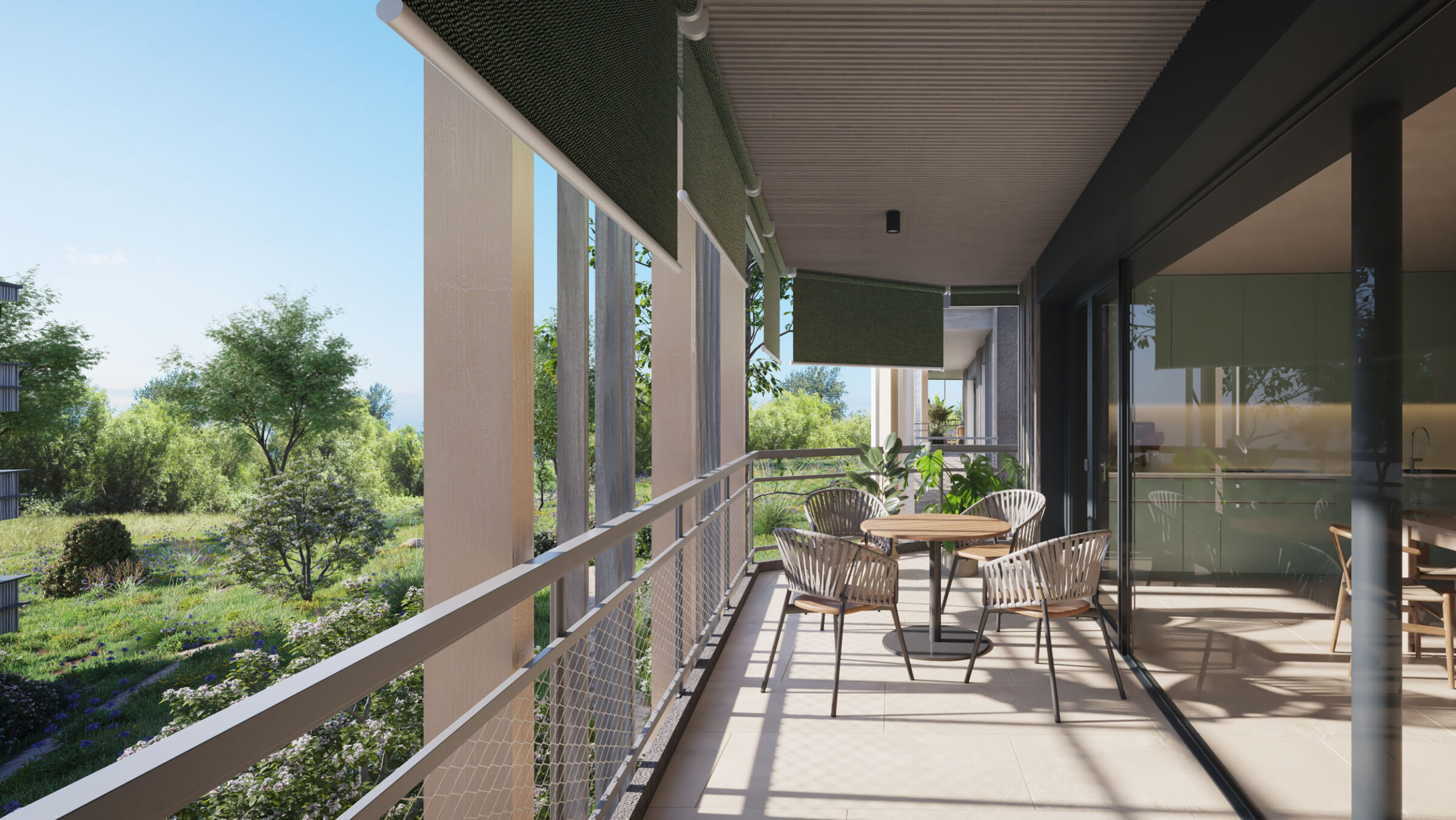 Der hochwertige Innenausbau mit keramischen Bodenbelägen in allen Räumen, mineralischen Wandfarben in einem harmonischen Farbkonzept und Naturholzdecken, Stoff-Markisen, die Loggia bildend sind und weiteren sorgfältig gestalteten Details, gewährleistet höchsten Wohnkomfort. Massgefertigte Einbauschränke bieten optimalen Stauraum. Grosszügige Terrassen mit Ausrichtung nach Süden öffnen den Blick ins Grüne.