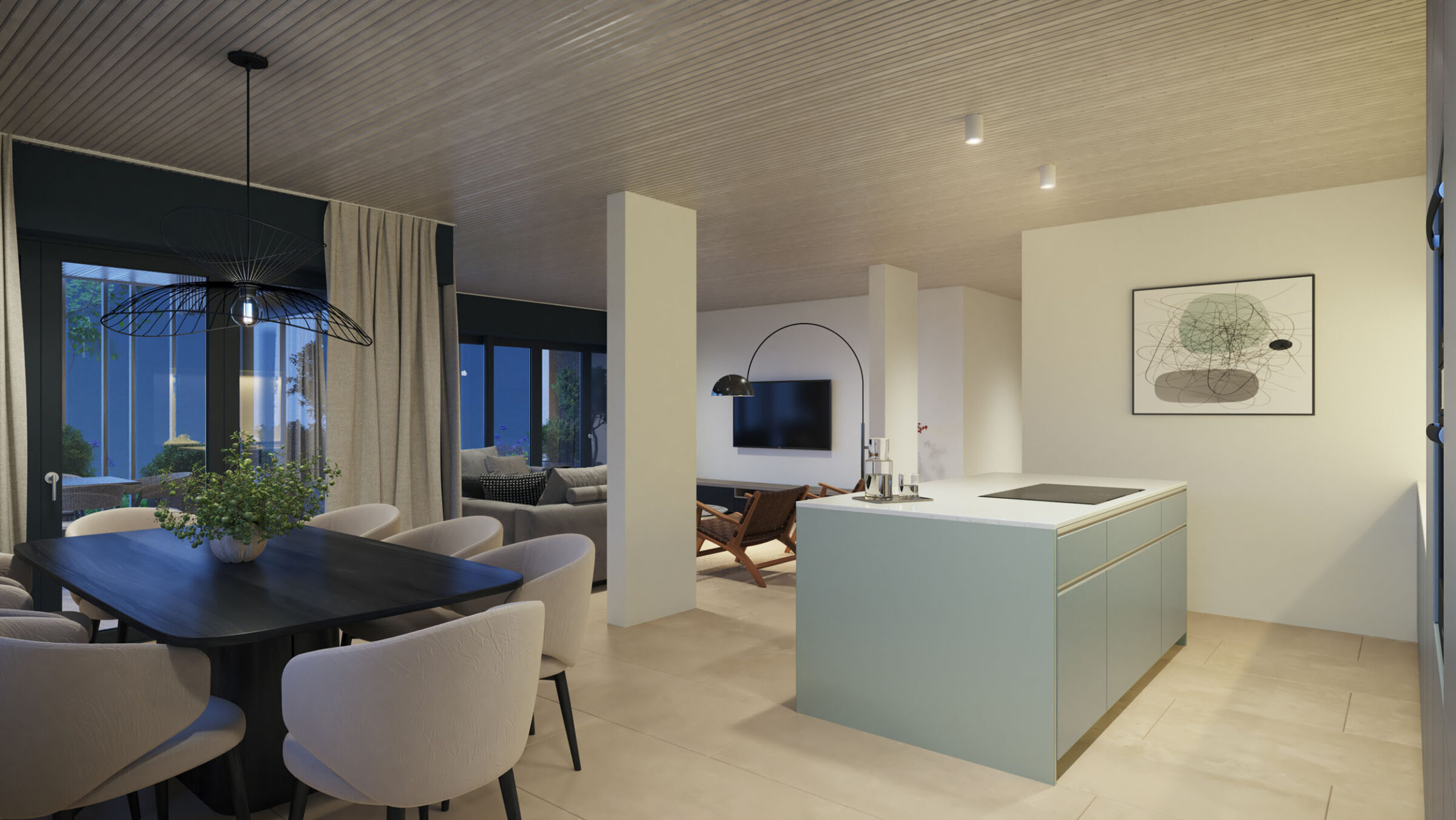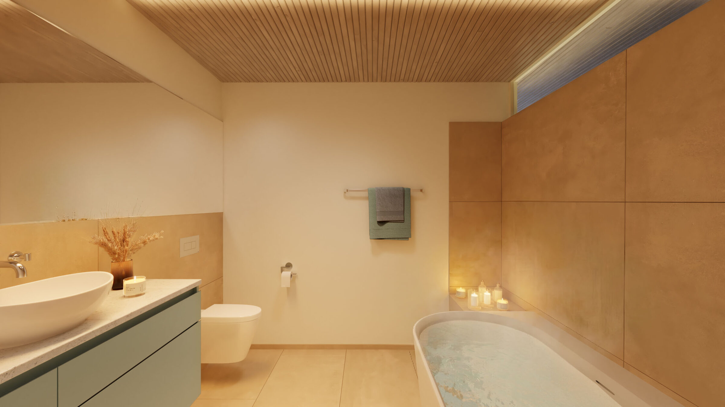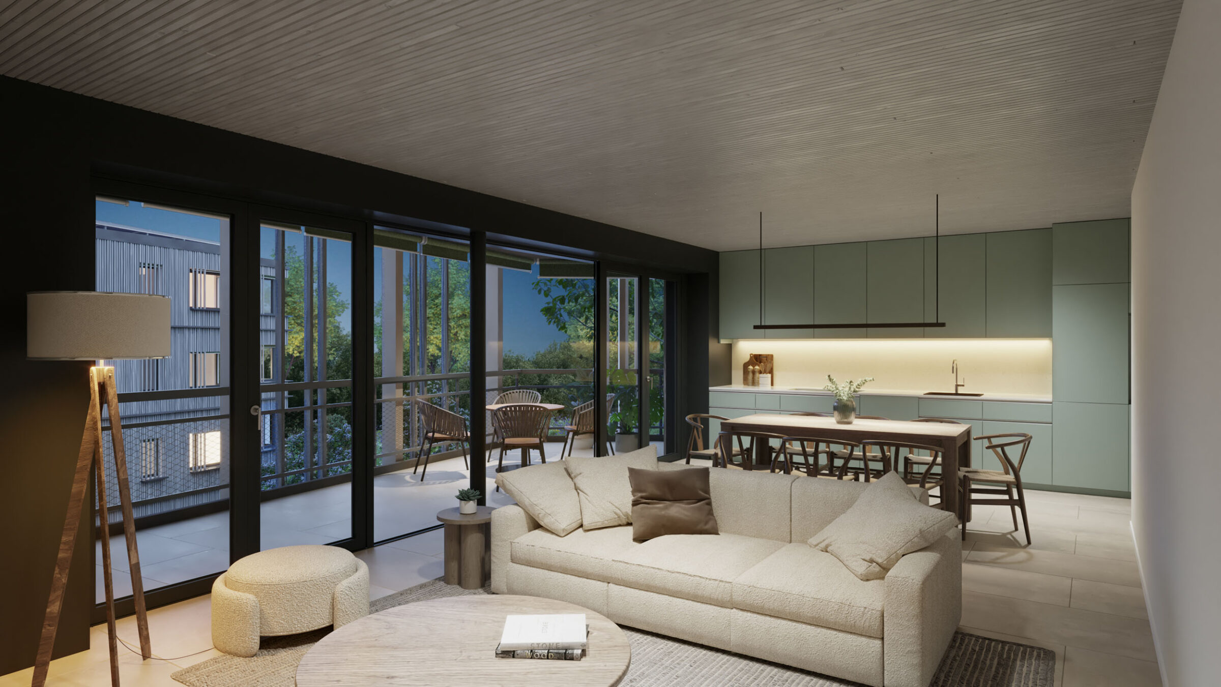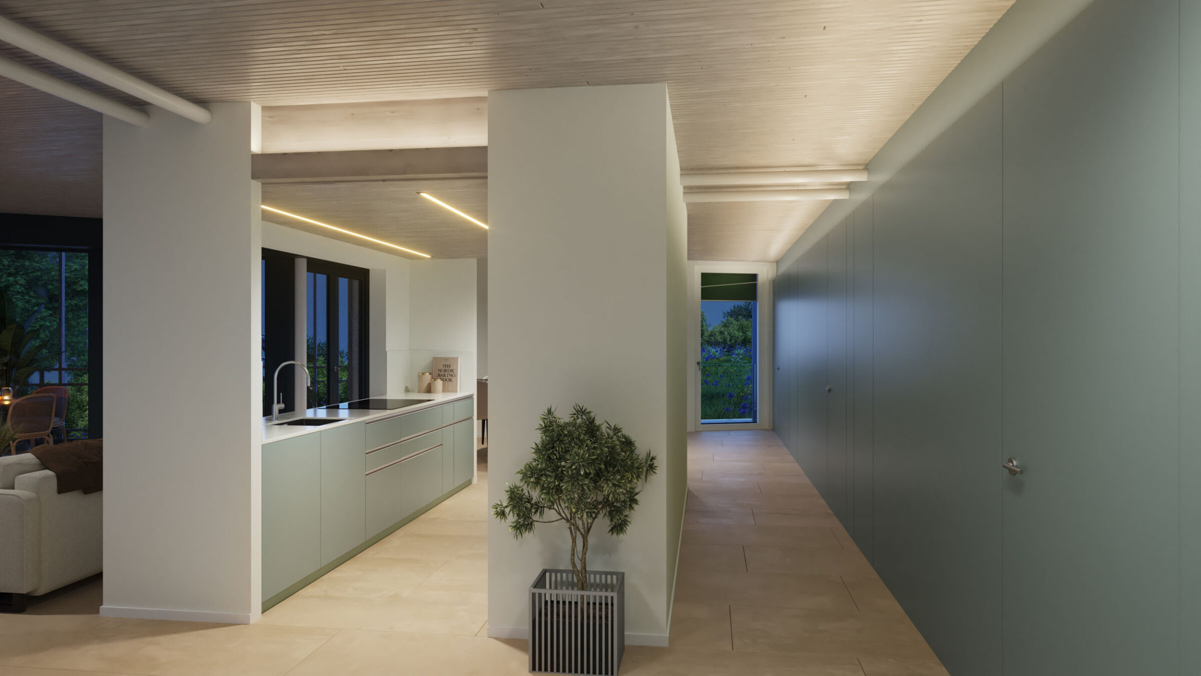 Der hochwertige Innenausbau mit keramischen Bodenbelägen in allen Räumen, mineralischen Wandfarben in einem harmonischen Farbkonzept und Naturholzdecken, Stoff-Markisen, die Loggia bildend sind und weiteren sorgfältig gestalteten Details, gewährleistet höchsten Wohnkomfort. Massgefertigte Einbauschränke bieten optimalen Stauraum. Grosszügige Terrassen mit Ausrichtung nach Süden öffnen den Blick ins Grüne.