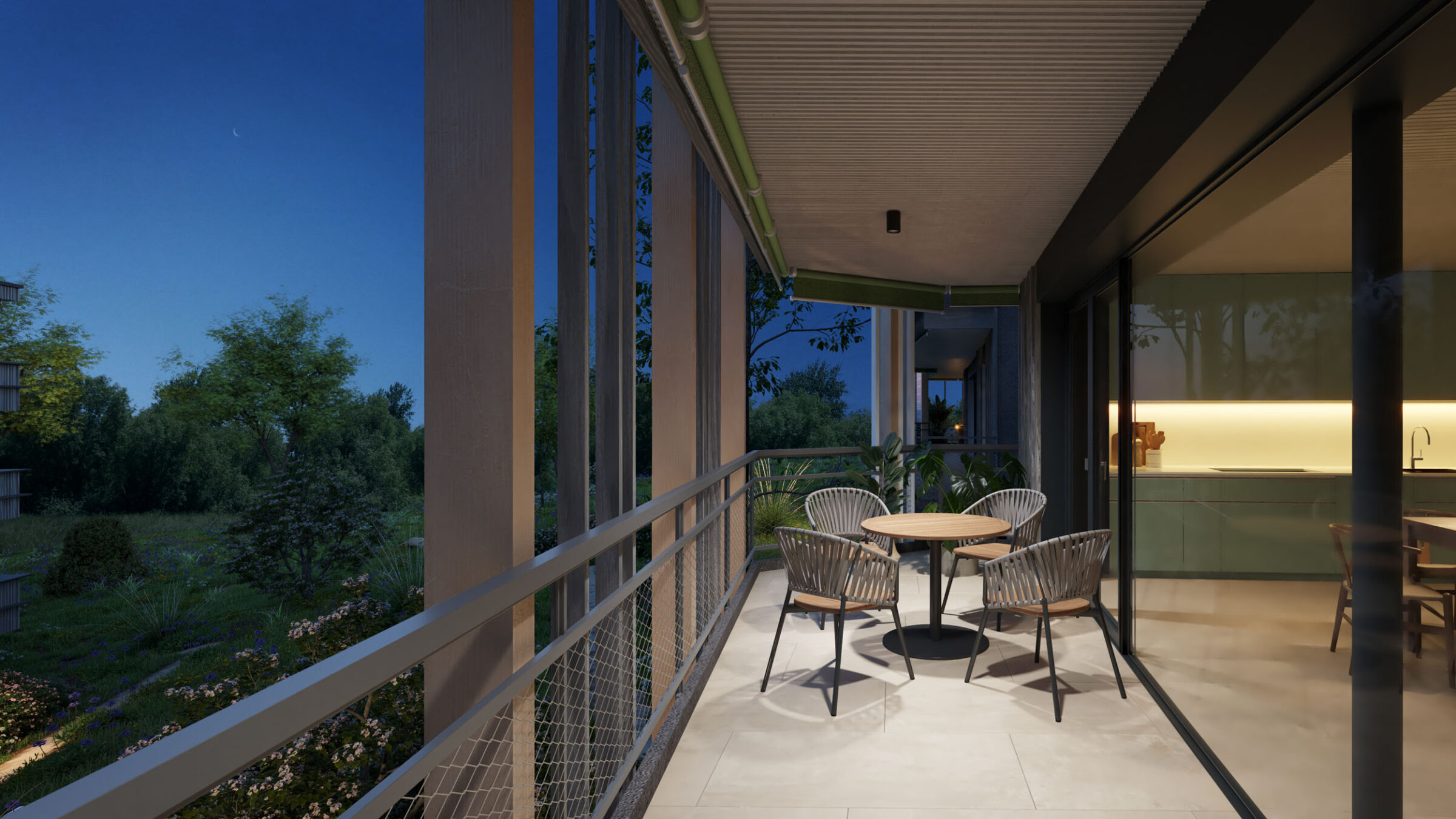 Die Häuser sind umgeben von einem naturnahen Lebensraum. Der Garten im Innenhof öffnet sich in die Weite nach Westen in Richtung unverbaubare Natur. Der artenreich gestaltete und ökologisch wertvolle Aussenraum mit einheimischer Bepflanzung geht nahtlos in die angrenzende Landwirtschaftszone über.